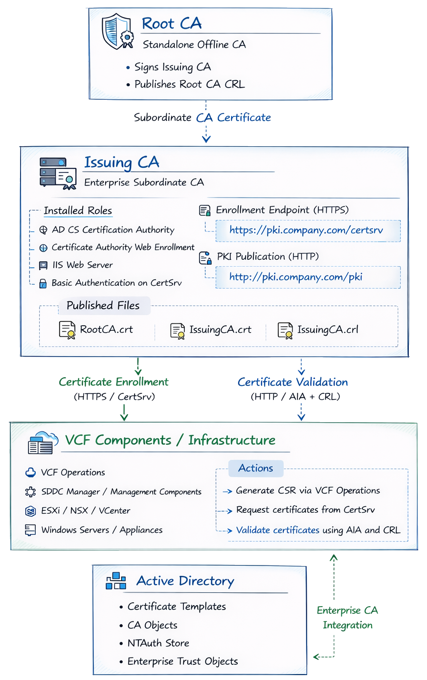 A typical enterprise PKI supporting VCF uses a two-tier hierarchy:
