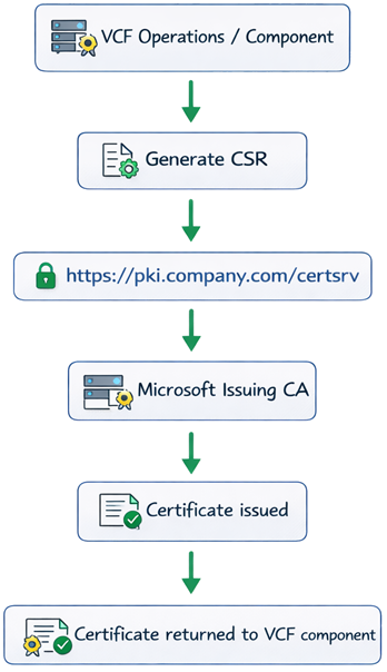 During enrollment, VCF Operations or a managed component generates a CSR and submits it to the Microsoft CA through CertSrv.