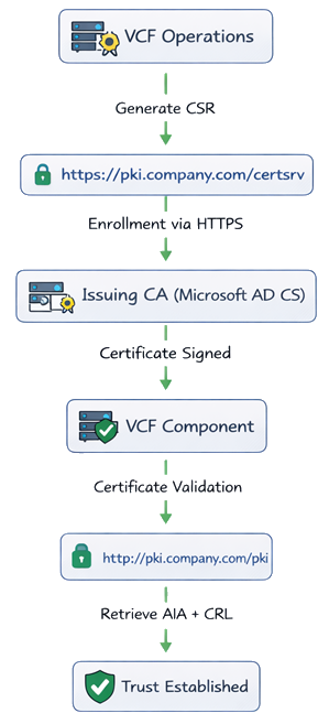 While the architecture shows where PKI components live, the following diagram shows how VMware Cloud Foundation interacts with Microsoft CA during certificate issuance and validation.